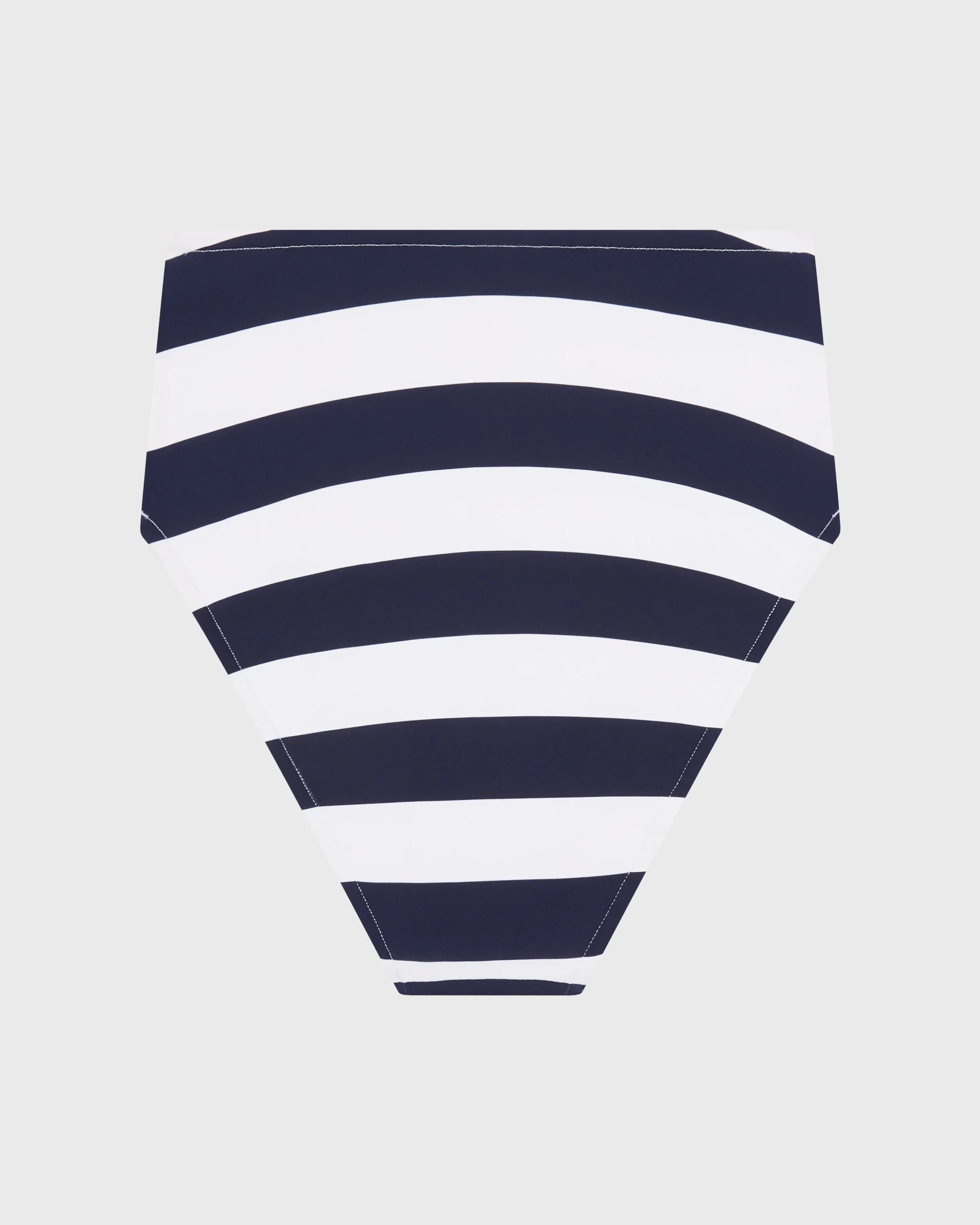 Fresh and nautical, the Poppy Bikini Bottom in Navy & White Stripe offers a playful take on a classic high-waist style. Made from our luxuriously soft Italian Embodee™ fabric, which is sustainably crafted, Poppy is self-lined for supreme comfort and gentle shaping power that refines the silhouette. A sporty high-cut leg line lengthens the legs while maintaining confident coverage.