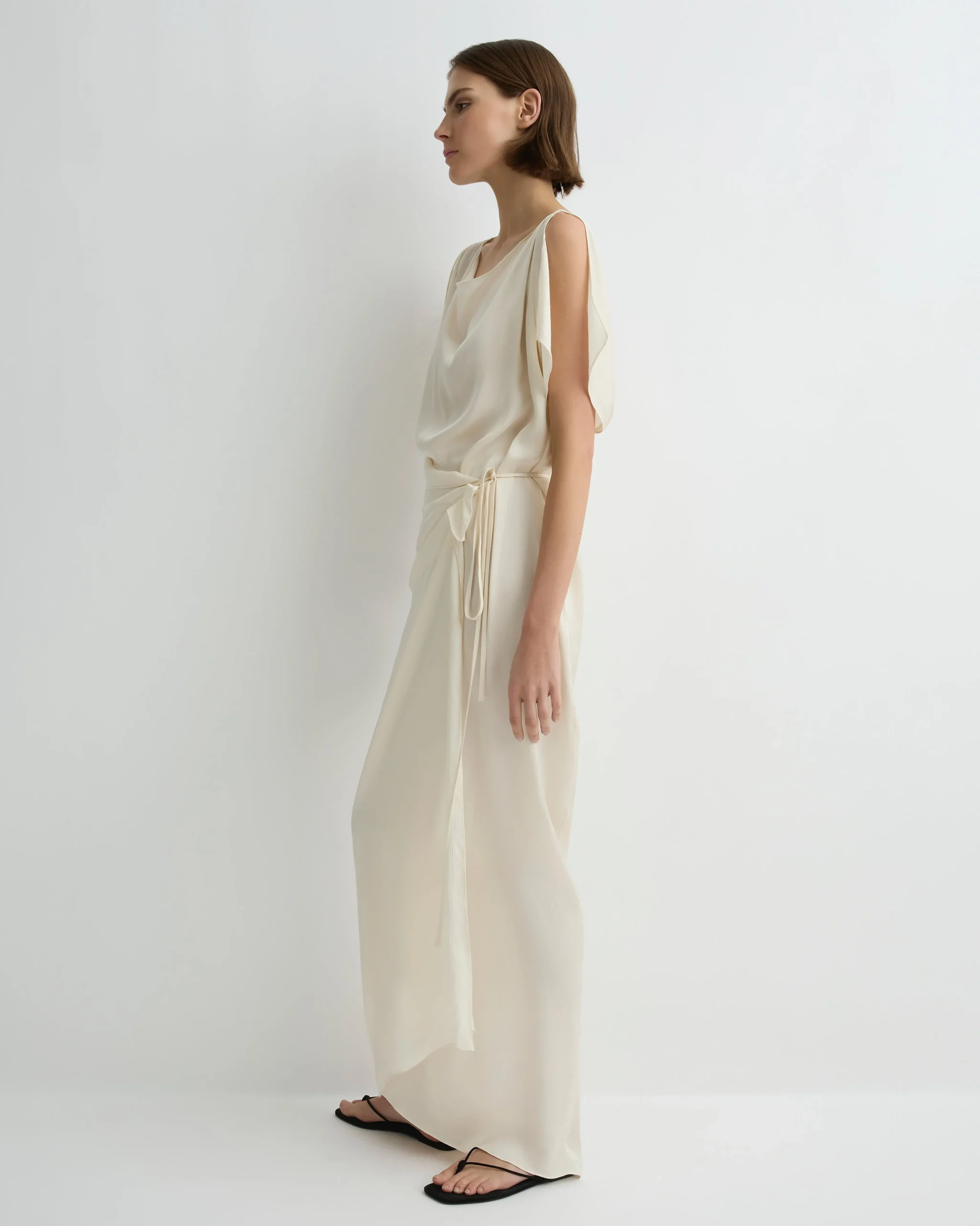 An elegant option for any special occasion, the Ardea Wrap Dress in Pearl is crafted from a fluid viscose blend with a luxurious hammered satin finish, chosen for its elegant draped silhouette. Moving effortlessly with the body, this dress features a cowl neck and open shoulder detail, exuding understated sophistication for event dressing or elevated evenings.