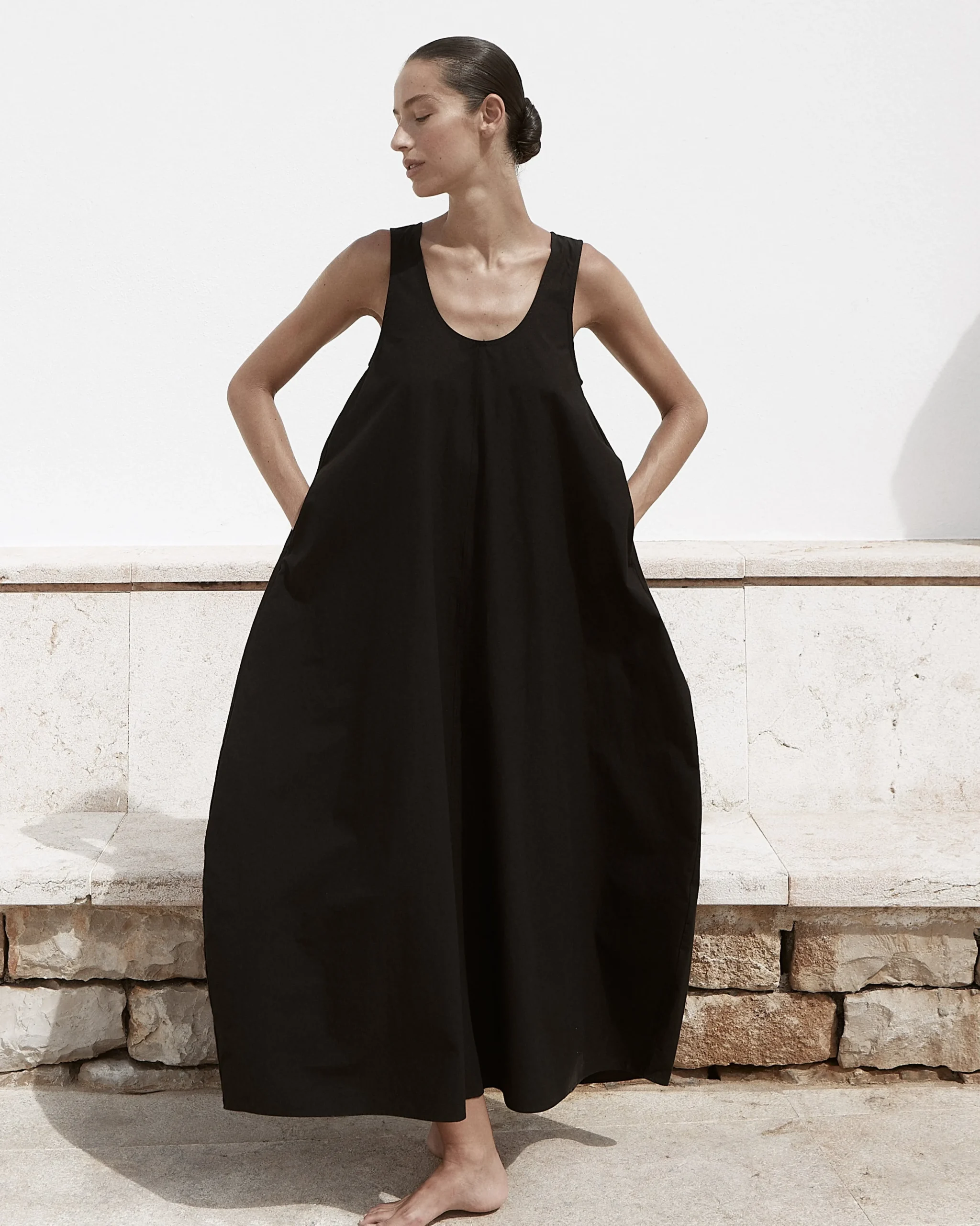The limited-edition Kyoto Cocoon Dress in black is crafted from structured Japanese Dry Cotton, creating a sculptural silhouette that remains breathable and lightweight. With clean panel detailing, side seam pockets and an ankle-length finish, it delivers modern minimalism with architectural ease.