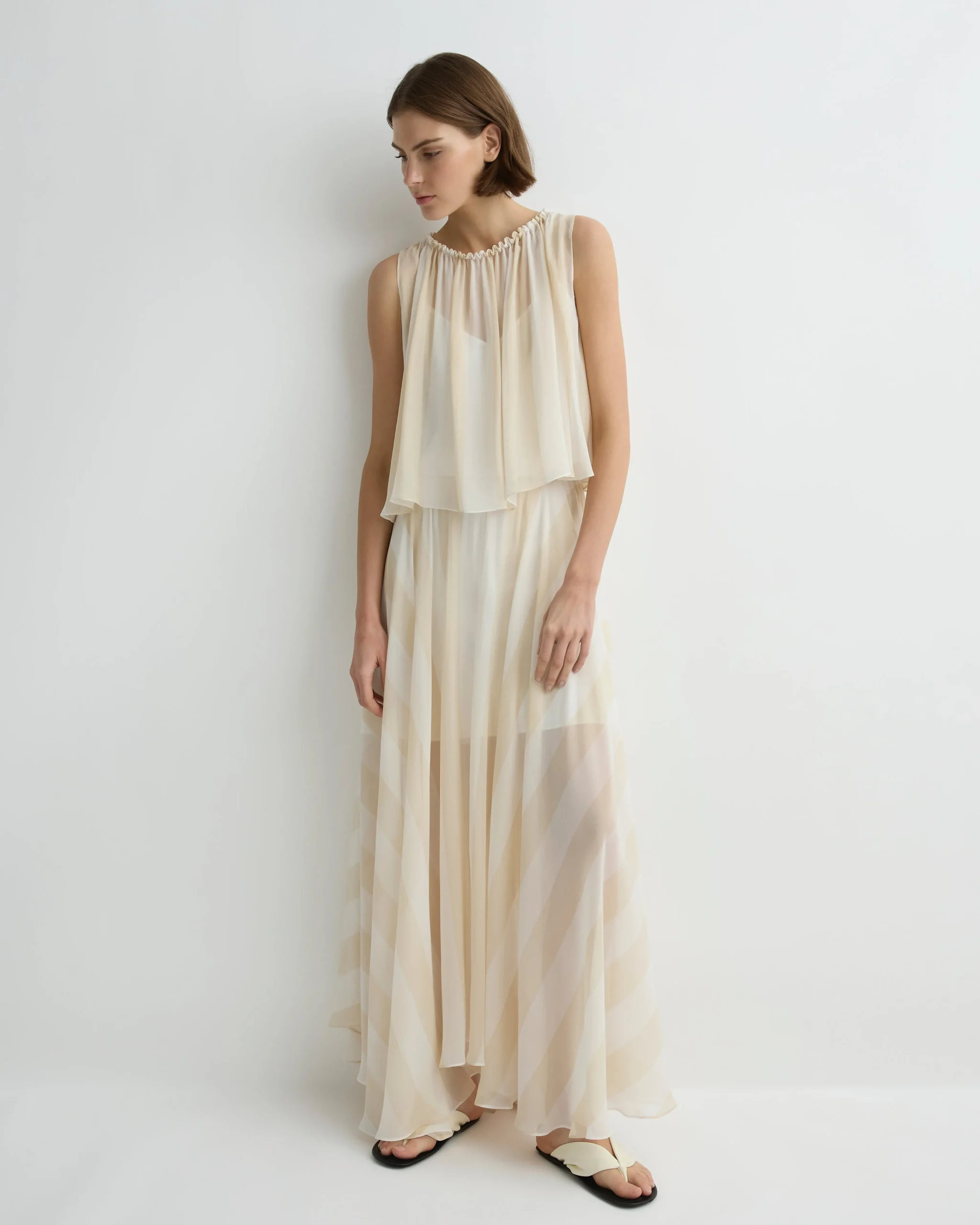 The Capri Silk Circle Skirt in ecru stripe delivers dramatic, weightless movement in a full-circle cut. Crafted in sheer silk georgette and lined with a soft viscose slip, this floor-length silhouette embodies refined, effortless elegance.