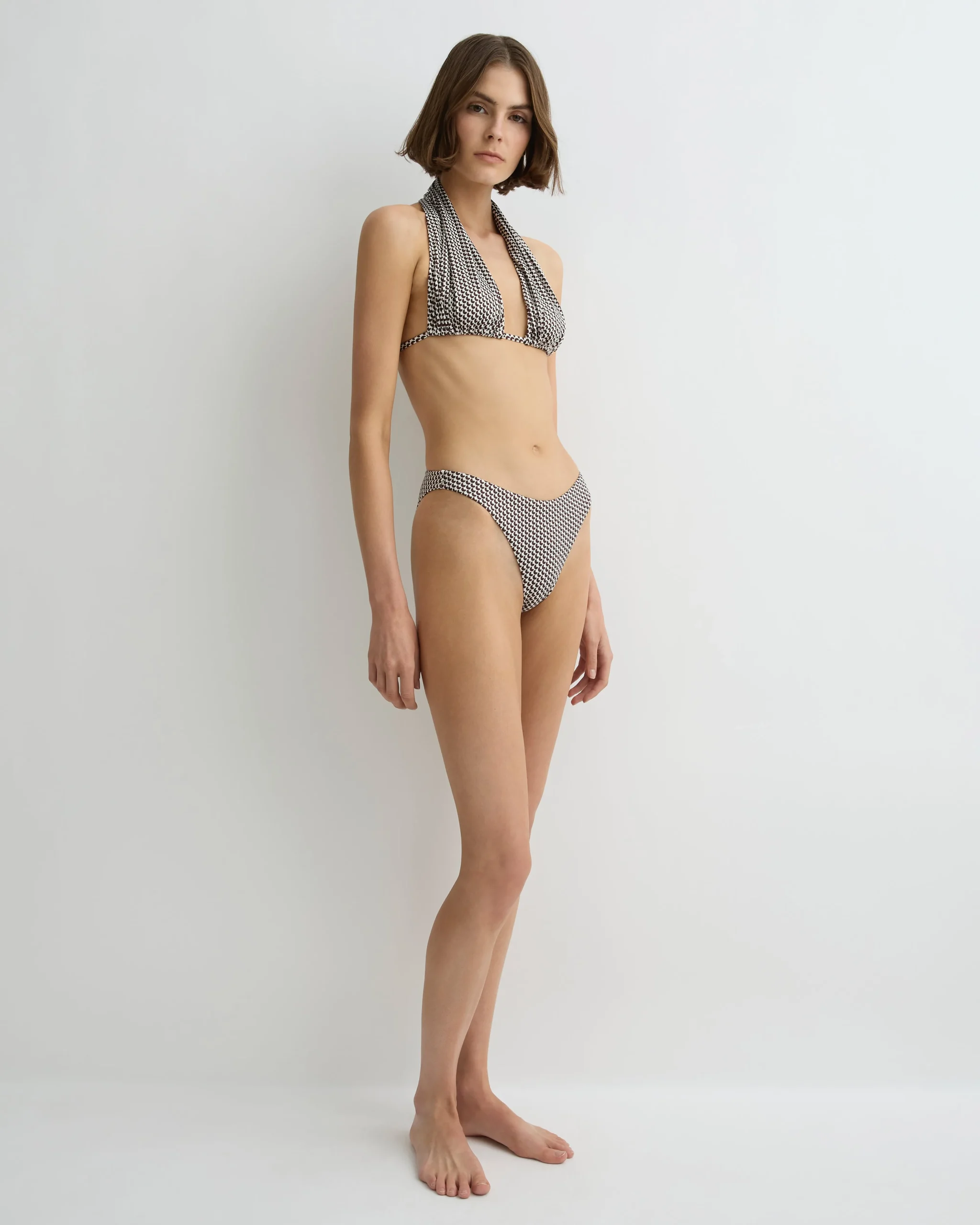 The Isabella Bikini Top in limited-edition Mocha Dot is defined by a wide, adjustable halter neckline with an elegant single gather. Featuring adjustable cup coverage and an underbust tie closure, this piece offers a considered balance of comfort, support, and elegance.