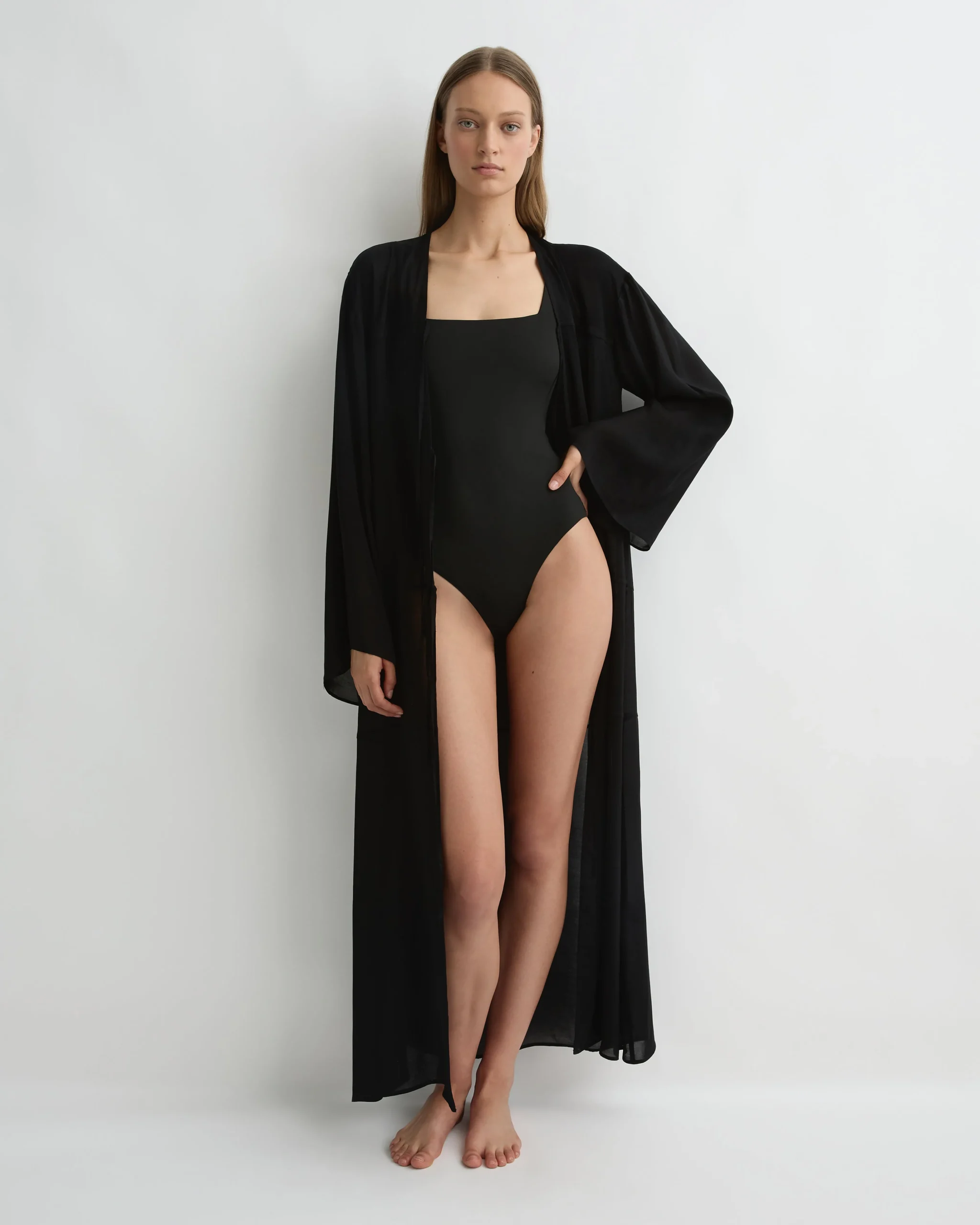 The Cremona Tie-Front Maxi Coverup in Black is a flowing, lightweight layer crafted from soft European rayon voile. Defined by its gently flared silhouette, panelled seams and relaxed long sleeves, this maxi-length design fastens with an elegant tie-front closure. Cut for a relaxed fit with flexible sizing, it slips easily over swimwear for effortless resort styling. Perfect layered over swim or our Como slips to offer added coverage beneath the sheer fabric.