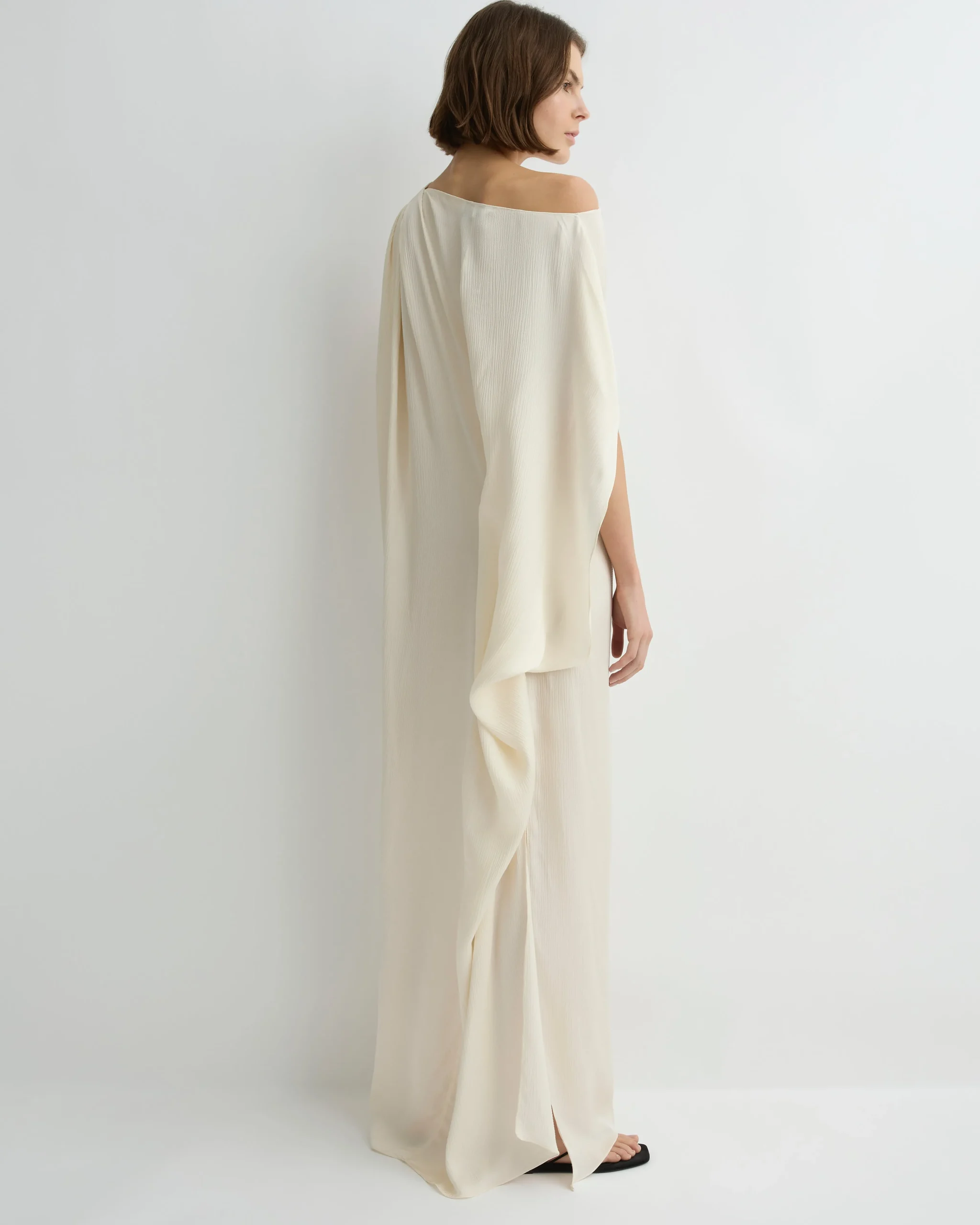 Cut from luxurious European Hammered Satin, the Ardea Asymmetric Maxi Dress in pearl brings sculptural elegance to warm-weather dressing. Its wide high neckline, asymmetric shoulder tucks and draped armhole create effortless movement and a modern, fluid silhouette. Relaxed through the body with a full-length fall, this piece embodies understated glamour.
