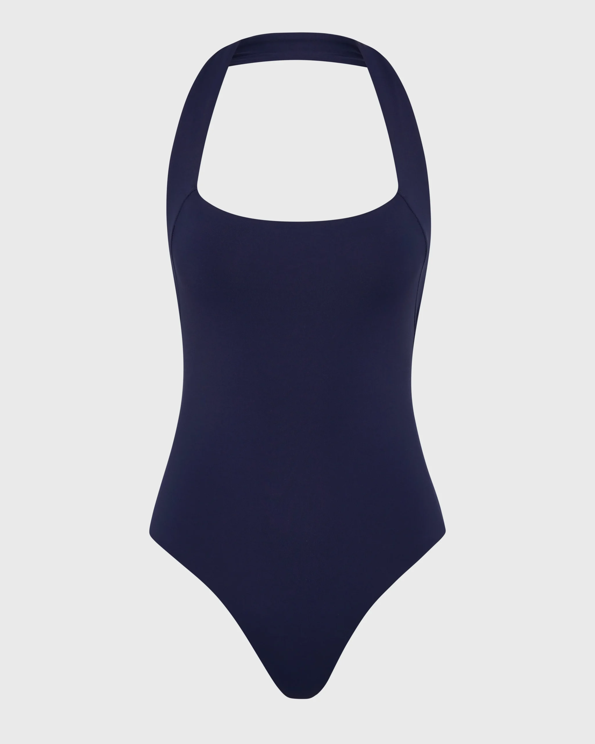 The Candice One Piece in classic Maritime navy is an elegant halterneck swimsuit with timeless appeal. Featuring a wide, elasticated strap that runs from under the arms to around the neck, Candice offers comfort and a flattering fit. A scoop back highlights the shoulders, while the clean, feminine silhouette transitions effortlessly from beach to bar, also working beautifully as a bodysuit. Candice is self-lined in our luxuriously soft Italian Embodee™ fabric, which is sustainably made and offers gentle shaping power to refine the silhouette. A versatile piece designed to remain a favourite in your summer wardrobe for years to come. Team with Bondi Born white and navy resort wear.