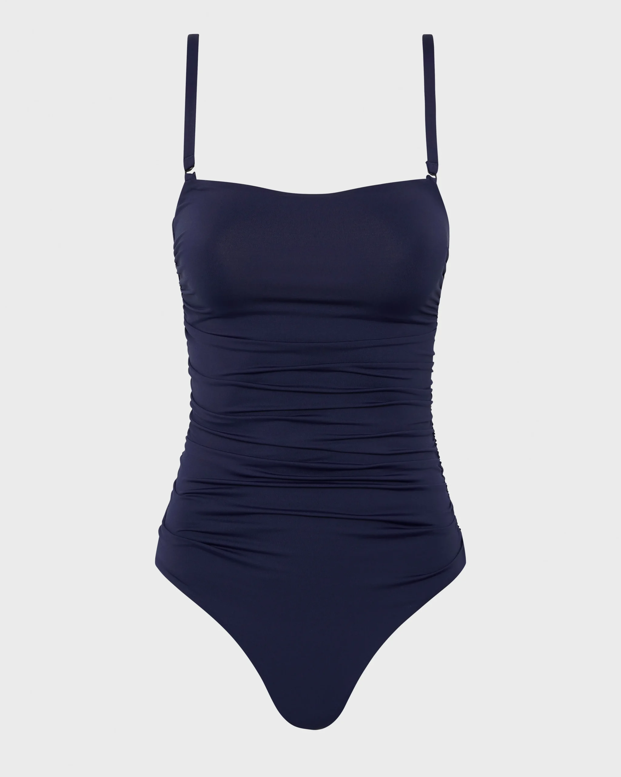 The Raya Bandeau One Piece in Maritime is a timeless swimwear silhouette designed for both comfort and confidence. Crafted from our ultra soft, Italian Embodee™ fabric with gentle shaping power, Raya features gathers across the stomach to flatter the silhouette. Invisible under bust support and detachable straps offer versatile styling. Ideal for larger bust sizes from C to F, Raya is a timeless piece for your summer wardrobe. This sustainably produced luxury fabric will last up to ten times longer than standard swim fabrics.