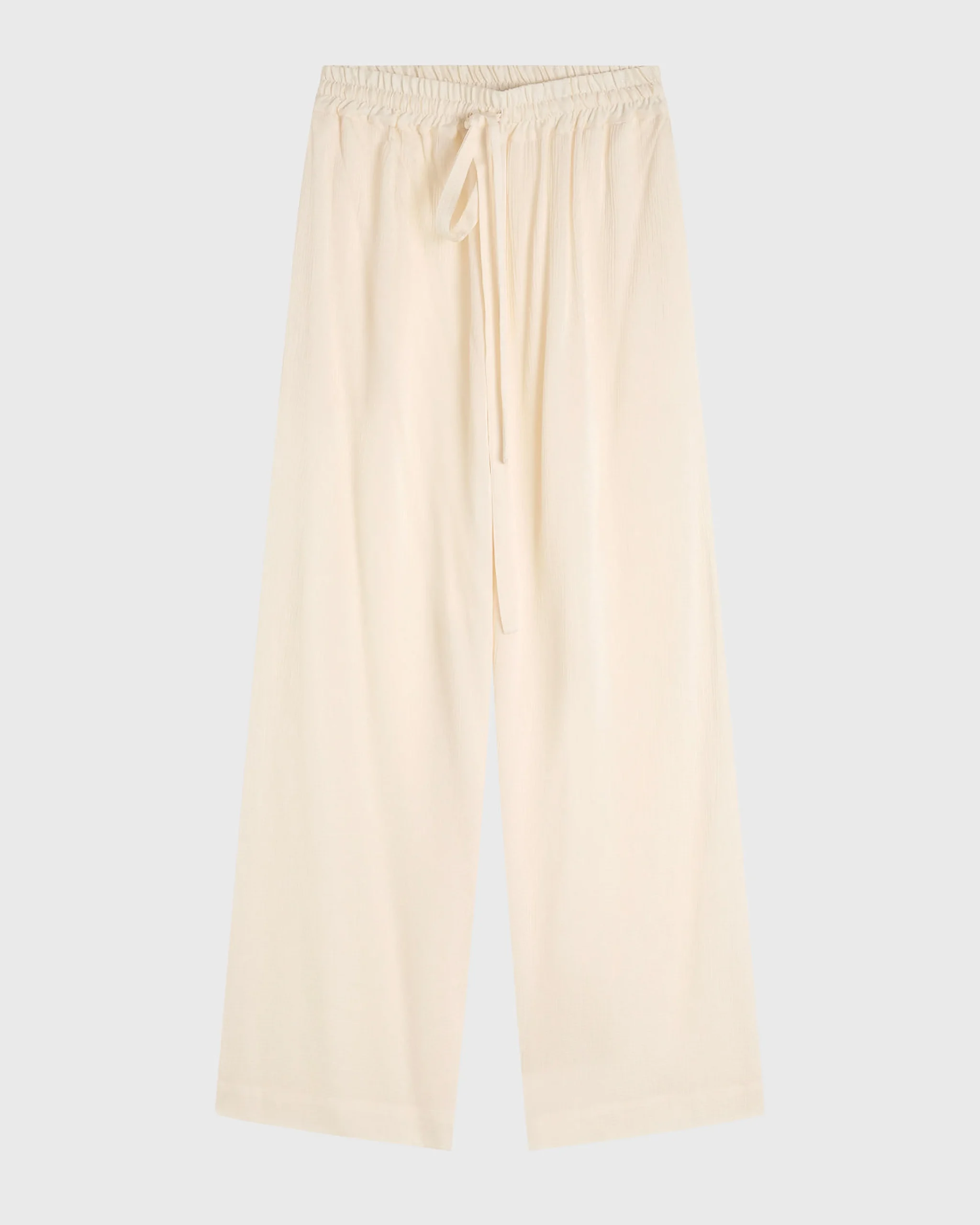 Effortlessly refined, the Ardea Luxe Pant in Pearl is cut from a fluid viscose blend with a luminous European hammered satin finish. Designed with a wide elasticated waistband and self-tie detail, this relaxed silhouette flows into a wide leg that moves gracefully with the body. Side seam pockets lend ease and versatility, while its draped leg balances comfort and polish.